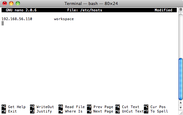 Bind a local host named "workspace" to the IP address : 192.168.56.110